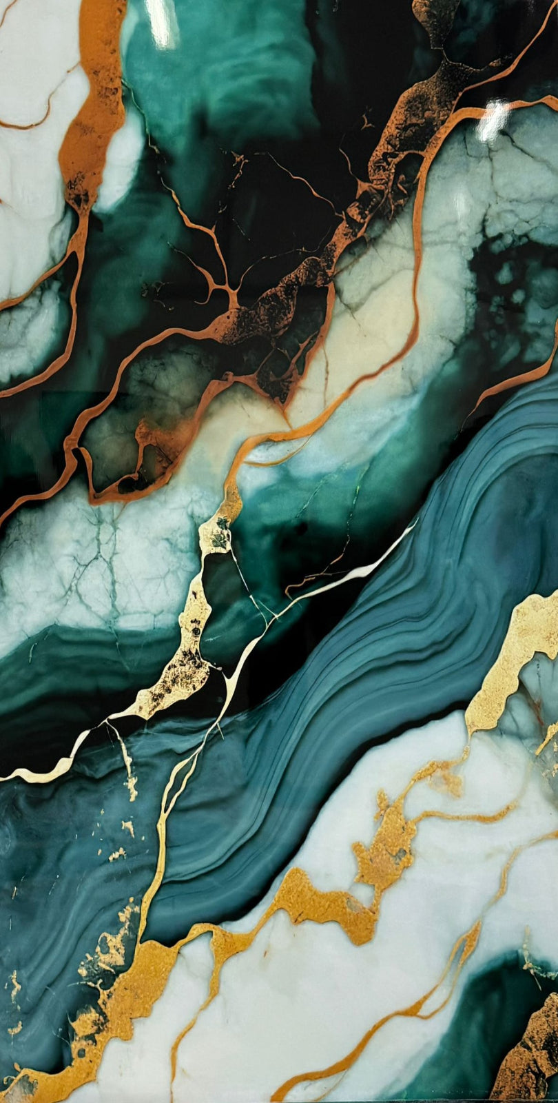 - Dekor: Abstrakte Marmoroptik in Smaragd-/Petrol-, Schwarz- und Weiss-/Cremetönen mit gold- und kupferfarbenen Adern