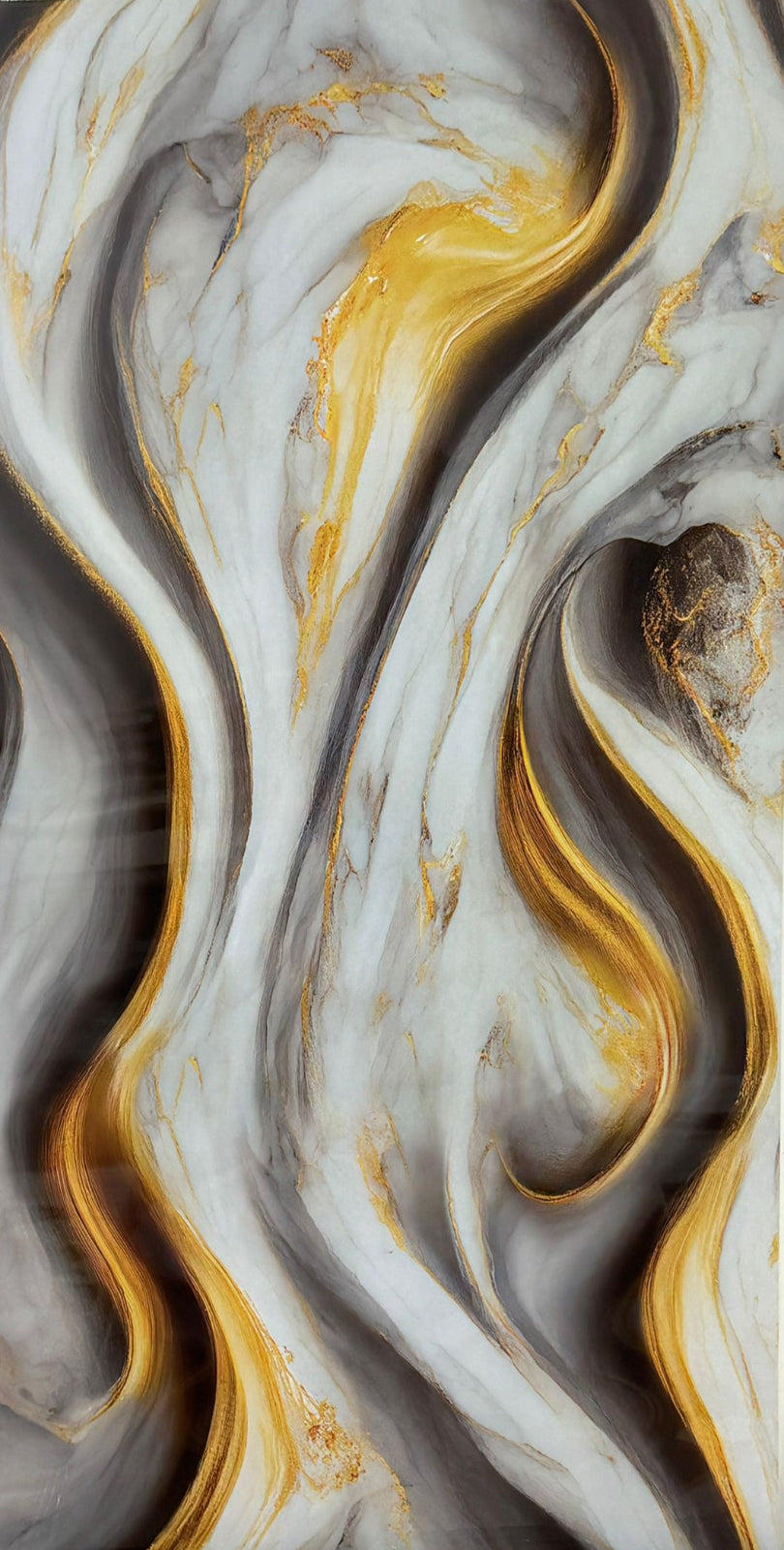 Dekoratives PVC-Wandpaneel im Grossformat mit edler, abstrakter Marmoroptik. Weiche, fliessende Strukturen in Weiss- und Grautönen werden von breiten, warmen Gold- und Bronzenuancen durchzogen. Die geschwungene Linienführung erinnert an polierte Natursteinschichten und verleiht Räumen einen luxuriösen, skulpturalen Charakter. Das Paneel besteht aus stabiler PVC-Hartschaumplatte mit glatter, glänzender Oberfläche. Es ist pflegeleicht, feuchtigkeitsbeständig und lässt sich schnell montieren, z. B. auf bestehenden Fliesen oder anderen glatten Untergründen. Geeignet für Wohnräume, Badezimmer (ausserhalb direkter Nasszonen je nach Abdichtung), Küchenrückwände* sowie repräsentative Gewerbeflächen. *Nicht direkt hinter Gas- oder offenen Kochfeldern verwenden; entsprechende Abstandsvorschriften beachten.