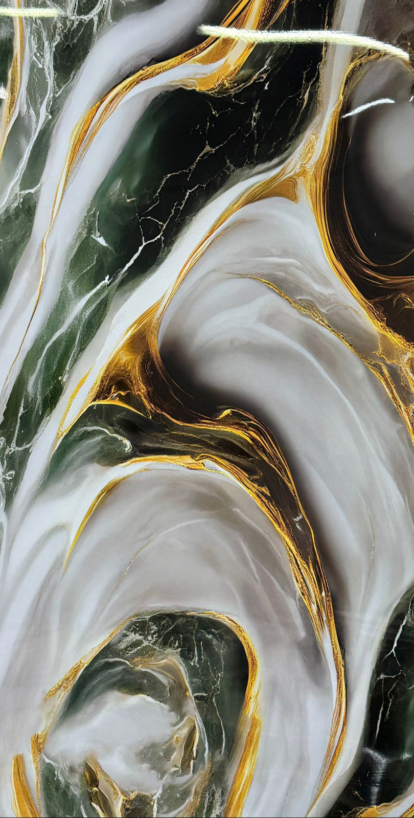 Dekoratives PVC-Wandpaneel im Grossformat mit extravagantem, abstraktem Marmor-Design. Fliessende Wirbel in Tiefgrün, Schwarz und warmen Goldtönen treffen auf weiche Weiss- und Cremenuancen und erzeugen eine dynamische, luxuriöse Steinoptik – ideal für markante Akzentwände und moderne Innenräume. Das Paneel besteht aus stabiler PVC-Hartschaumplatte mit glatter, glänzender Oberfläche. Es ist pflegeleicht, feuchtigkeitsbeständig und lässt sich schnell montieren, z. B. auf bestehenden Fliesen oder anderen glatten Untergründen. Geeignet für Wohnräume, Badezimmer (ausserhalb direkter Nasszonen je nach Abdichtung), Küchenrückwände* sowie repräsentative Gewerbeflächen. *Nicht direkt hinter Gas- oder offenen Kochfeldern verwenden; entsprechende Abstandsvorschriften beachten.