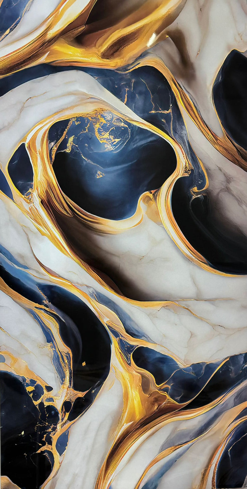 Dekoratives PVC-Wandpaneel im Grossformat mit edlem, abstraktem Marmor-Design. Fliessende Strukturen in Tiefblau, Schwarz und warmen Goldtönen treffen auf helle, marmorierte Bereiche und erzeugen eine luxuriöse Steinoptik – ideal, um Wände zu einem Blickfang zu machen. Das Paneel besteht aus stabilem PVC mit glatter, glänzender Oberfläche. Es ist pflegeleicht, feuchtigkeitsbeständig und lässt sich schnell montieren, z. B. auf bestehenden Fliesen oder glatten Untergründen. Perfekt für Wohnräume, Badezimmer (ausserhalb direkter Nasszonen je nach Abdichtung), Küchenrückwände* und repräsentative Gewerbeflächen. *Nicht direkt hinter Gas- oder offenen Kochfeldern verwenden; entsprechende Abstandsvorschriften beachten.