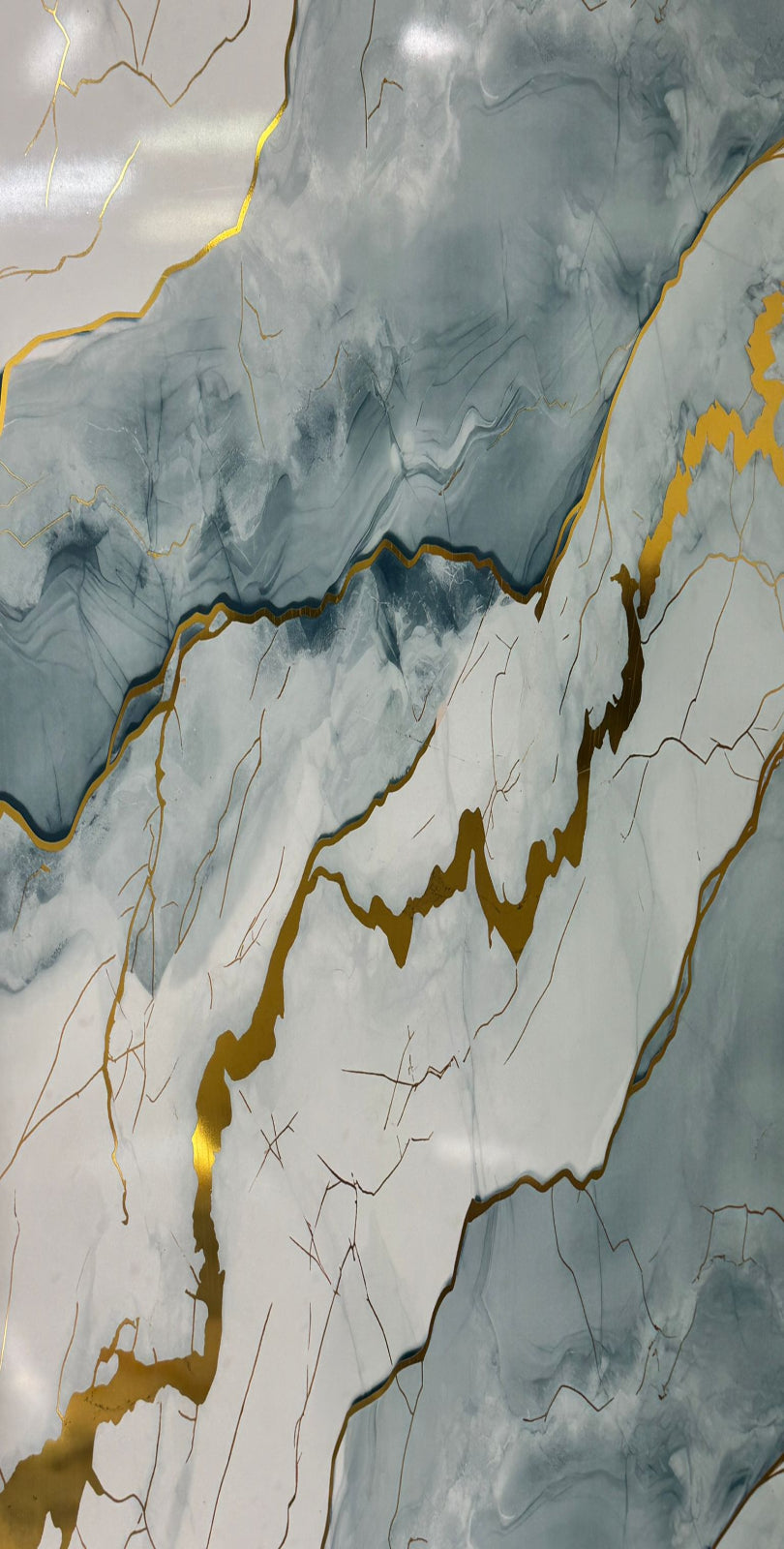 Dekoratives PVC-Wandpaneel im Grossformat mit elegantem Marmor-Design in kühlen Blau-Grau- und Weissnuancen. Sanft verlaufende, wolkige Strukturen werden von markanten, goldfarbenen Adern durchzogen und erzeugen eine ruhige, gleichzeitig hochwertige Steinoptik – ideal für moderne, helle Innenräume. Das Paneel besteht aus stabilem PVC mit glatter, glänzender Oberfläche. Es ist pflegeleicht, feuchtigkeitsbeständig und lässt sich schnell montieren, z. B. auf bestehenden Fliesen oder anderen glatten Untergründen. Geeignet für Wohnräume, Badezimmer (ausserhalb direkter Nasszonen je nach Abdichtung), Küchenrückwände* sowie repräsentative Gewerbeflächen. *Nicht direkt hinter Gas- oder offenen Kochfeldern verwenden; entsprechende Abstandsvorschriften beachten.